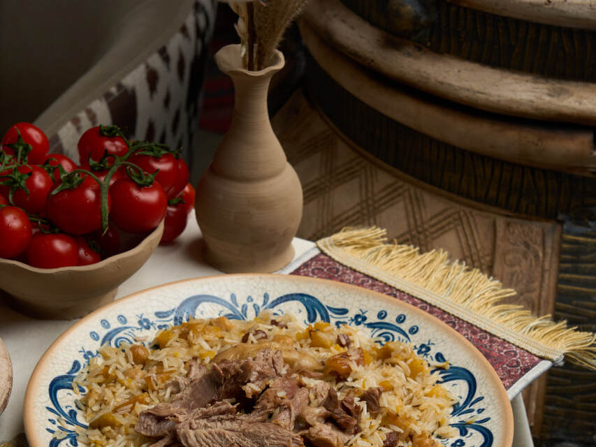 In Rishton (Fergana Region) — an Uzbek town famed for its pottery — Art Choyxona Rishton fuses food with decorative craftsmanship. The interiors are adorned with handcrafted ceramics by hereditary artisans, featuring turquoise glaze — a secret passed down through generations. The star dish is a fragrant Rishtan plov ($32 per kg), served with achchik shurpa — a rich broth of lamb bones, chili, and vegetables. Locals call it “voh-voh shurvo” for the delight it inspires.