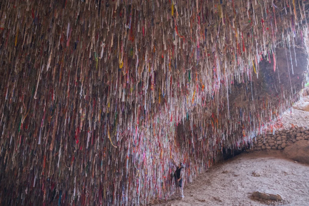 The towering, almost vertical walls here reach up to 200 meters, while the width of the gorge ranges from 15 to 300 meters. The cave vault is adorned with countless colorful ribbons. There is a local belief that you need to dip a ribbon in clay, throw it onto the stone arch, and make your dearest wish. If it sticks, the wish is destined to come true.
