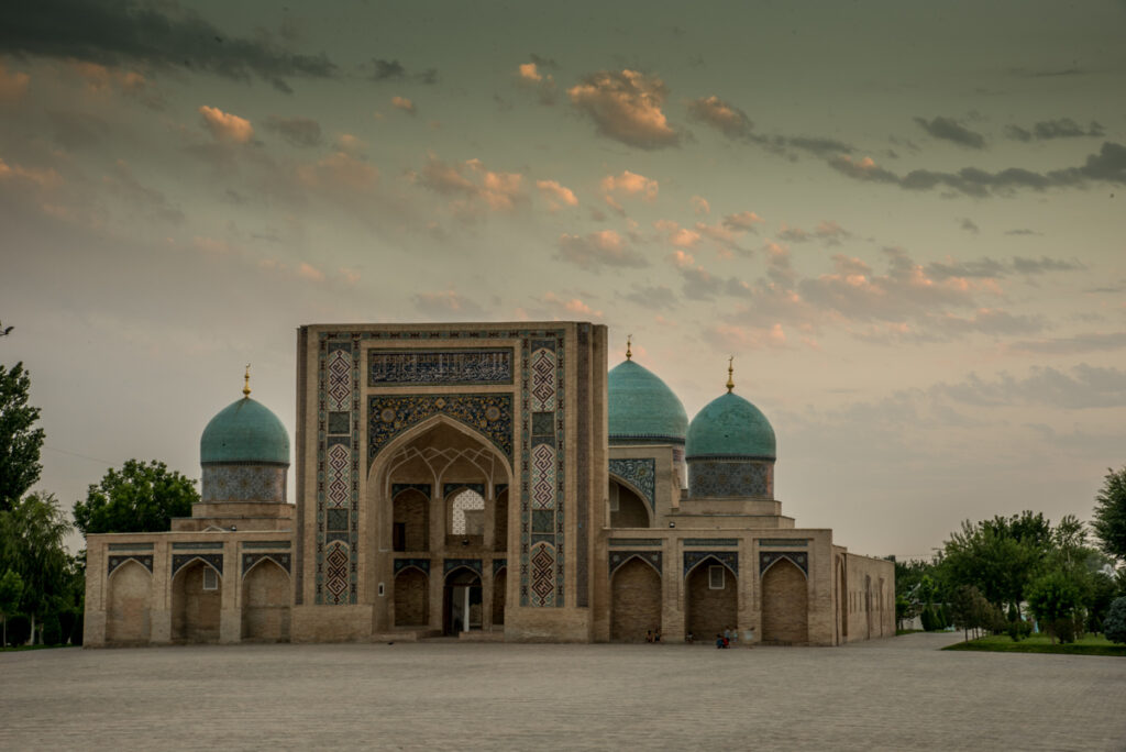 Позже ансамбль дополнился зданием Духовного управления мусульман Узбекистана и пятничной мечетью. Соборная мечеть Хазрати Имам находится в самом начале комплекса, у проезжей части. Ее минареты — самые высокие в городе. По словам моего учителя Дильбар Абдунабиевой, они достигают 58,5 метров, хотя во многих источниках указывается 53 метра. В самой мечети постелен удивительной красоты бесшовный ковер, выполненный в Турции специально для этого зала.