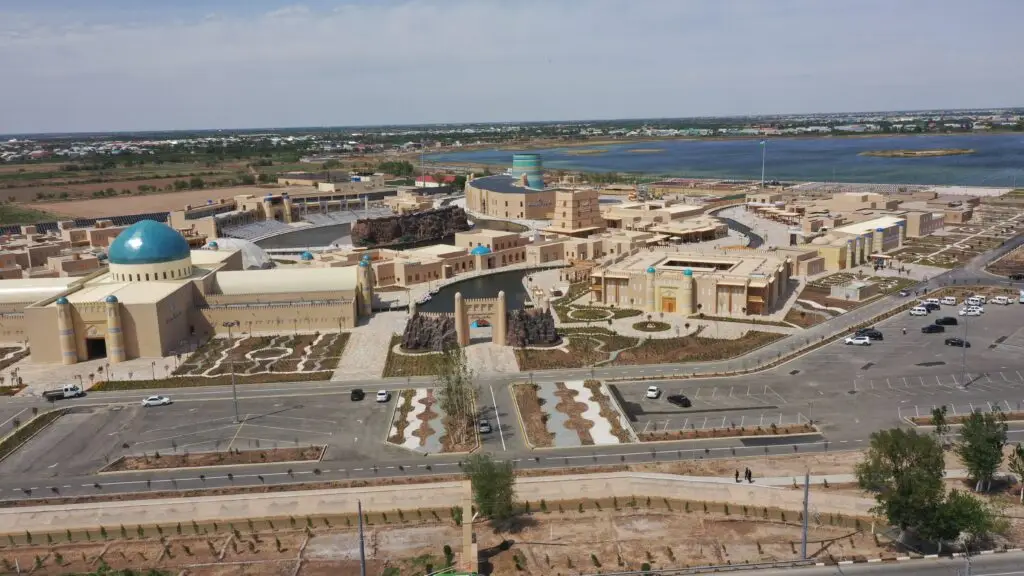 Через ворота Кош-дарвоза попадаешь в маленькую Хиву: здесь копии Кальта-Минор, средневековых фасадов и канал с гондолами. Хорезмская Венеция для неспешных прогулок. Мы направились в ювелирный центр Elxoros, построенный по образцу Чодра Ховли – загородного дворца XIX века, принадлежавшего хивинскому хану. Здесь, в прохладе кондиционеров – спасение. Лифтом мы поднялись на пятый этаж – на террасу с прекрасным панорамным видом на новый город. Здесь любят устраивать фотосессии местные фотографы, туристы и молодожены. Именно отсюда виден масштаб нового города. Несмотря на палящее солнце, в парке было много народу, кафешки были заполнены.