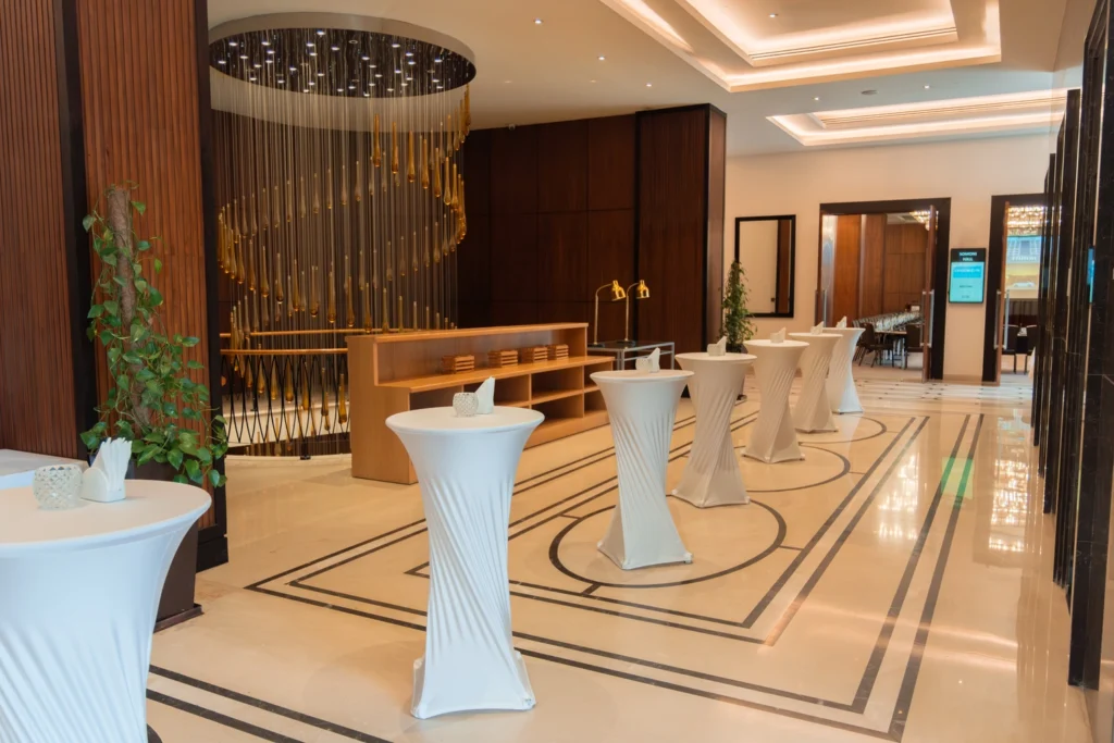 Отель предоставляет полный комплекс услуг по организации мероприятий: техническое оснащение, декор и индивидуальные меню. Кейтеринговая команда также работает с выездными событиями за пределами отеля.