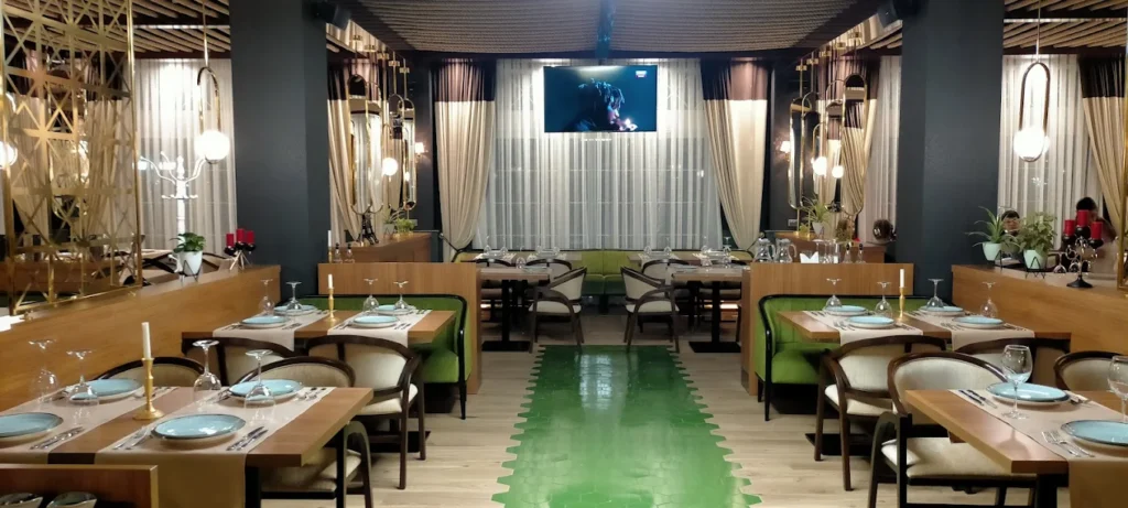 Утро здесь начинается со шведского стола: горячие блюда, свежие салаты, выпечка — все подают в большом зале с панорамными окнами. Здесь можно заказать лагман и суши, запеченное мясо и пасту, традиционные супы и легкие закуски.
