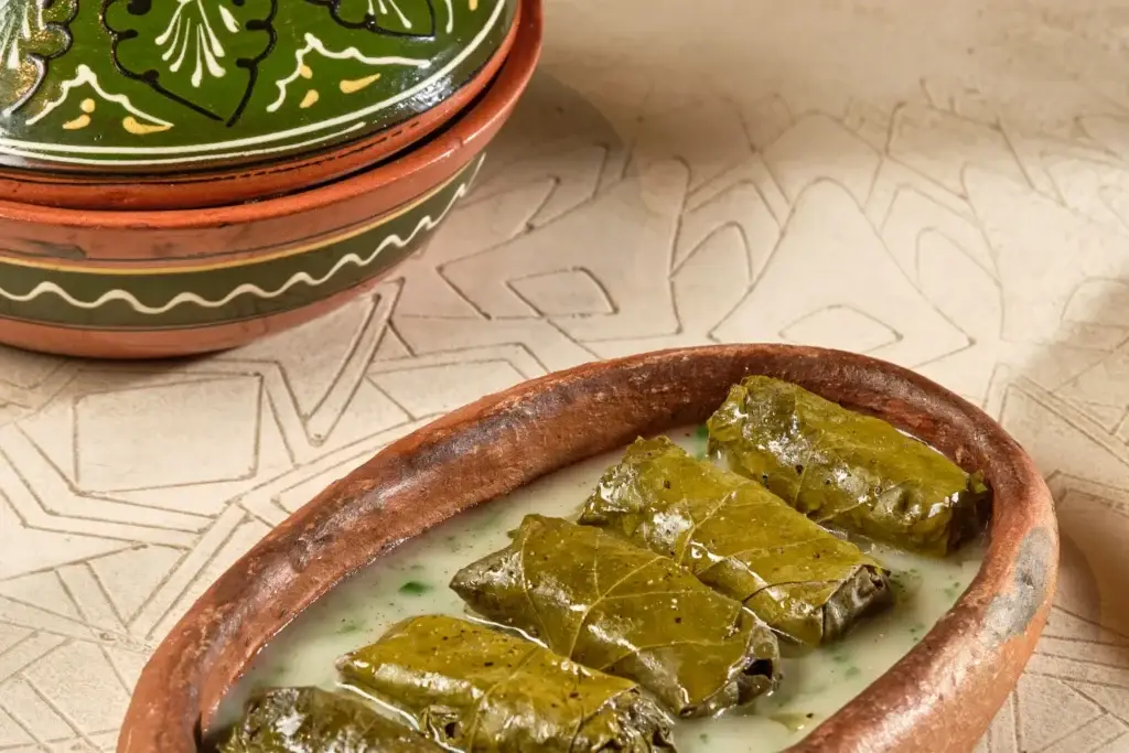 Меню ресторана построено как путешествие по вкусам трёх регионов. Блюда знакомят гостей с культурой через вкус и подачу. В меню представлены марокканский тажин с уткой, дымляма, жиз-биз с барбарисом, лосось в дубовых листьях, а также авторские версии долмы и самсы. Завершает ужин шафрановая пахлава.