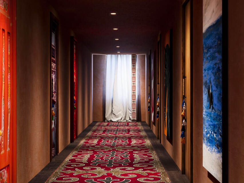 На следующий день, по дороге к завтраку, рассмотрел стены: в каждой нише, в каждом изгибе – росписи и символы, всплывающие в памяти воспоминания о предках. Официанты в одежде, скроенной по национальным мотивам из натуральных тканей, будто сошли со страниц эпоса. Я не удержался и спросил, кто все это создавал, рисовал и шил. Арт-директор Sun Group Александр Баланец рассказал, что направлял художников: не копировать этнику, а прочувствовать землю, не рисовать степь, а вспомнить ее. Росписи в общественных пространствах выполнены художницей Анель Ошан, автор картин в номерах – художник Азат Табиев, а дизайнер одежды для персонала – Алмаз Керимбек.