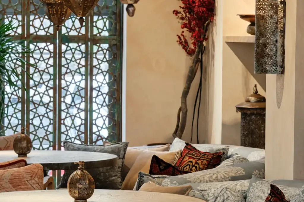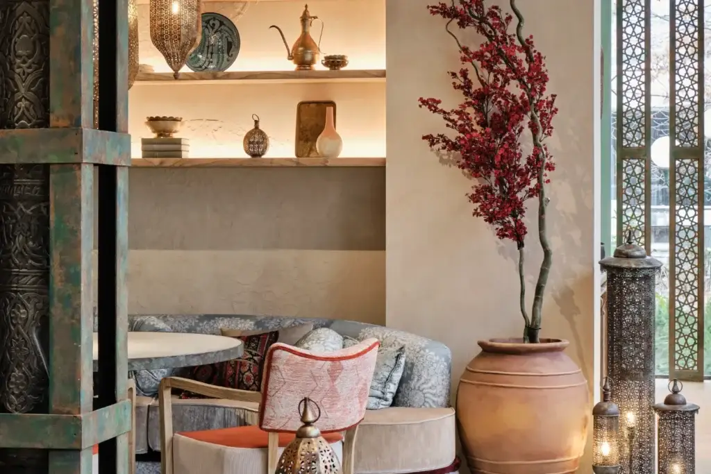 The interior creates a sense of movement and discovery. Pastel tones, carpets, handmade ceramics, brass lighting, and warm color accents shape a calm and welcoming atmosphere. The main hall takes inspiration from a Moroccan riad — an intimate, enclosed space that invites guests to linger.
